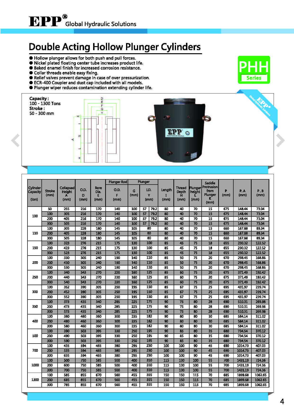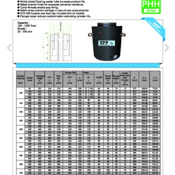 | Model | Capacity(ton) | Stroke(mm) | Outside Dia(mm) | Hold Dia(mm) | Collapsed Height (mm) | Working Pressure(kg/c㎡) | Weight(kg) |