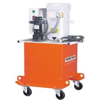 With high tonnage double-acting cylinders, the Power Team 400 series offers both single or multiple cylinder applications. Two-speed high output pump delivers up to 5 gpm (16 liter/min) of oil, with a low noise level of 73-80 dBA. Integral electrical shut-down feature prevents unintentional restarting of motor following an electrical service interruption. Over-current protection prevents damage to motor as a result of overheating. “Stop” and “Start” control buttons are 24 volt. PE4004 has a 4-way/3-position manual valve. The PE4004S has a 4- way/3-position solenoid valve with a 24 volt remote hand switch. External pressure relief valve is adjustable from 1,500 to 10,000 psi (100 to 700 bar). Heavy duty 4" (50,8 mm) diameter casters assure easy maneuvering. 20 gallon (3,927 cu. in. usable) / 75,7 liter (62,8 liter usable) reservoir has a low oil level sight gauge. Powered by a dual voltage 10 hp (7,46 kW), 3 phase, 1,725 (1,437) rpm motor. 3 phase motor has all the electrical components necessary to operate the pump.The customer has no hidden charges when making purchase. Deliver 1,200 cu. in./min. (16 liter/min) of oil @ 200 psi (15 bar), 420 cu. in./min. (5,6 liter/min) of oil @ 10,000 psi (700 bar).