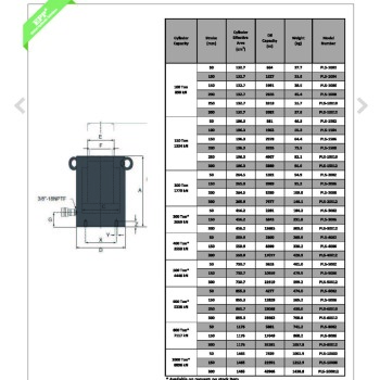 | Model | Capacity (ton) | Stroke (mm) | Outside Dia (mm) | Plunger Dia (mm) | Collapsed Height(mm) | Working Pressure(kg/c㎡) | Piston Area (c㎡) |
